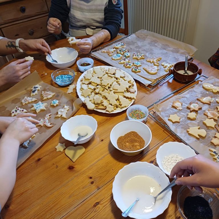 Ausstechförmchen als Sterne, Engel, Herzen, Blumen, bunte Perlen, Zuckerguss, Goldglitzer, Walnüsse, Kakao: Die Plätzchen-Saison ist eröffnet und die „Weihnachtsbäckerei“ auf dem Merjehop ist gut aufgestellt. Schon am Vormittag sitzen Bewohnerinnen und Bewohner mit einer Mitarbeiterin in der ofenbeheizten Küche, stechen Teig aus und dekorieren die fertig gebackenen Plätzchen. Ein süßer Duft erfüllt die Luft und verbreitet vorweihnachtliche Stimmung.