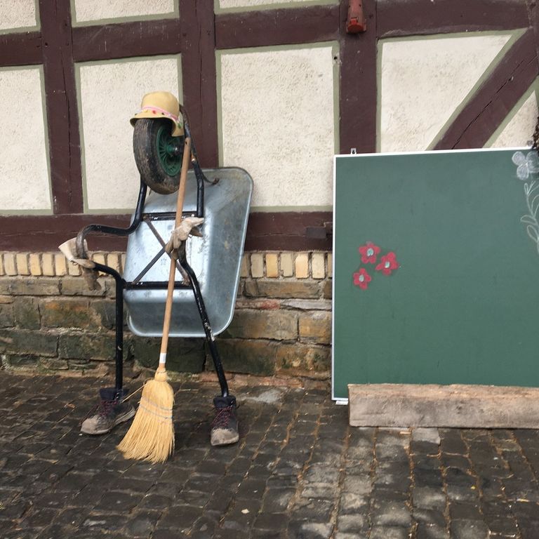„Herzlich willkommen auf dem Opperhof“ scheint der freundliche Schubkarrenmann Besucherinnen und Besuchern zuzurufen. Er steht mit seinem Besen lässig gelehnt an die Scheune, neben ihm eine Tafel, auf die Angebote der Tagestruktur oder Wünsche oder auch ein „herzliches Willkommen“ getragen werden können. Kreativität hat im Hofalltag vom Merjehop ihren festen Platz.