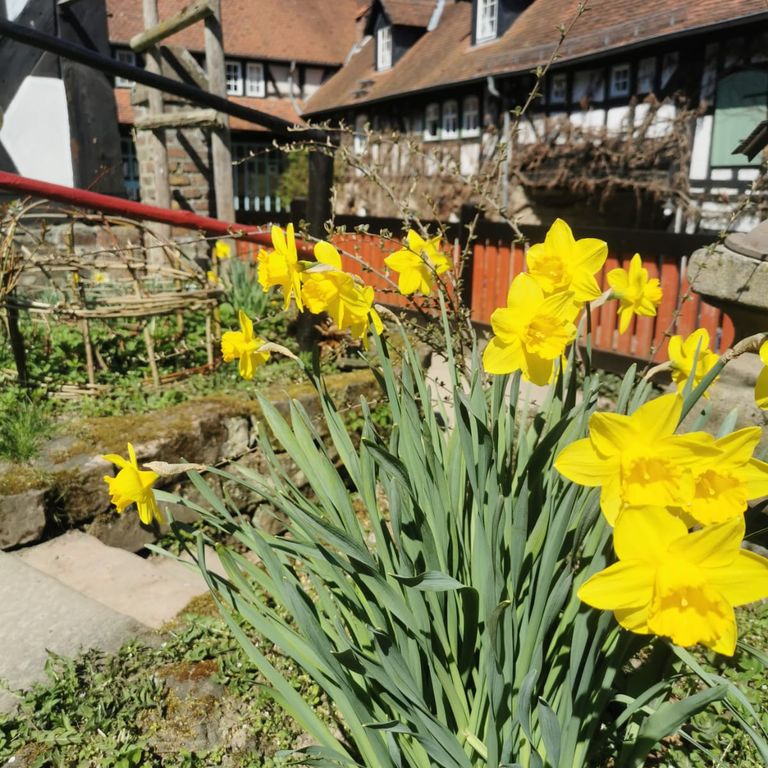 Der Merjehop ist in Osterstimmung! Bunte Eier hängen in den Büschen und Bäumen in und vor dem Hof, in der Kreativgruppe werden Ostereier mit Naturfarben eingefärbt und in der Küche duftet es nach Kuchen und Hefezöpfen. Osterglocken blühen, wohin das Auge sieht. Alles in Allem steht die Osterzeit dem denkmalgeschützten Hof sehr gut.