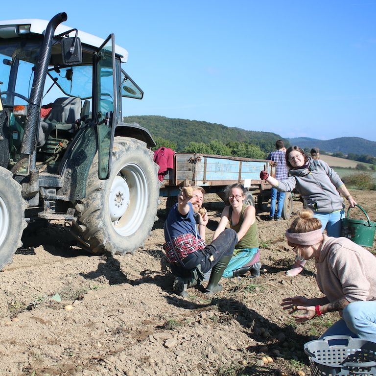 Alle Jahre wieder ist die Kartoffelernte eine wundervolle Gemeinschaftsaktion des Hofs. Wer kann, geht oder fährt aufs Feld und packt ordentlich mit an beim Auflesen und Befüllen des Anhängers. Wer nicht so gut kann, unterstützt durch Anwesenheit und bestärkende Worte am Feldrand. Gegessen und gefeiert wird auf jeden Fall zusammen. Und die Ernte können alle in den nächsten Monaten genießen.